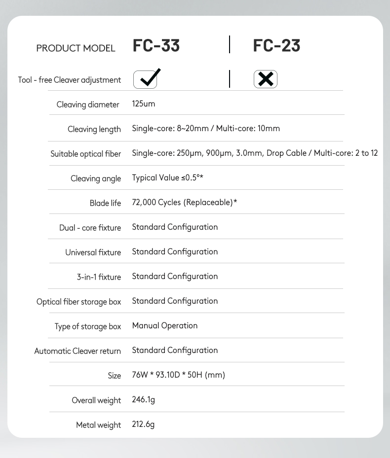 | Tool-free cleaver adjustment | ✔ | ✘ |